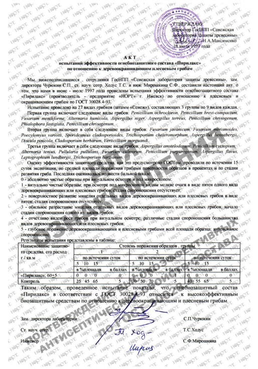 Эффективность по отношению к деревоокрашивающим и плесневым грибам (ГОСТ 30028.4) | Высокоэффективный антисептик: Защищает от поражения плесневыми и деревоокрашивающими грибами, жуком-древоточцем, термитами, лечит ранее пораженную древесину.* |