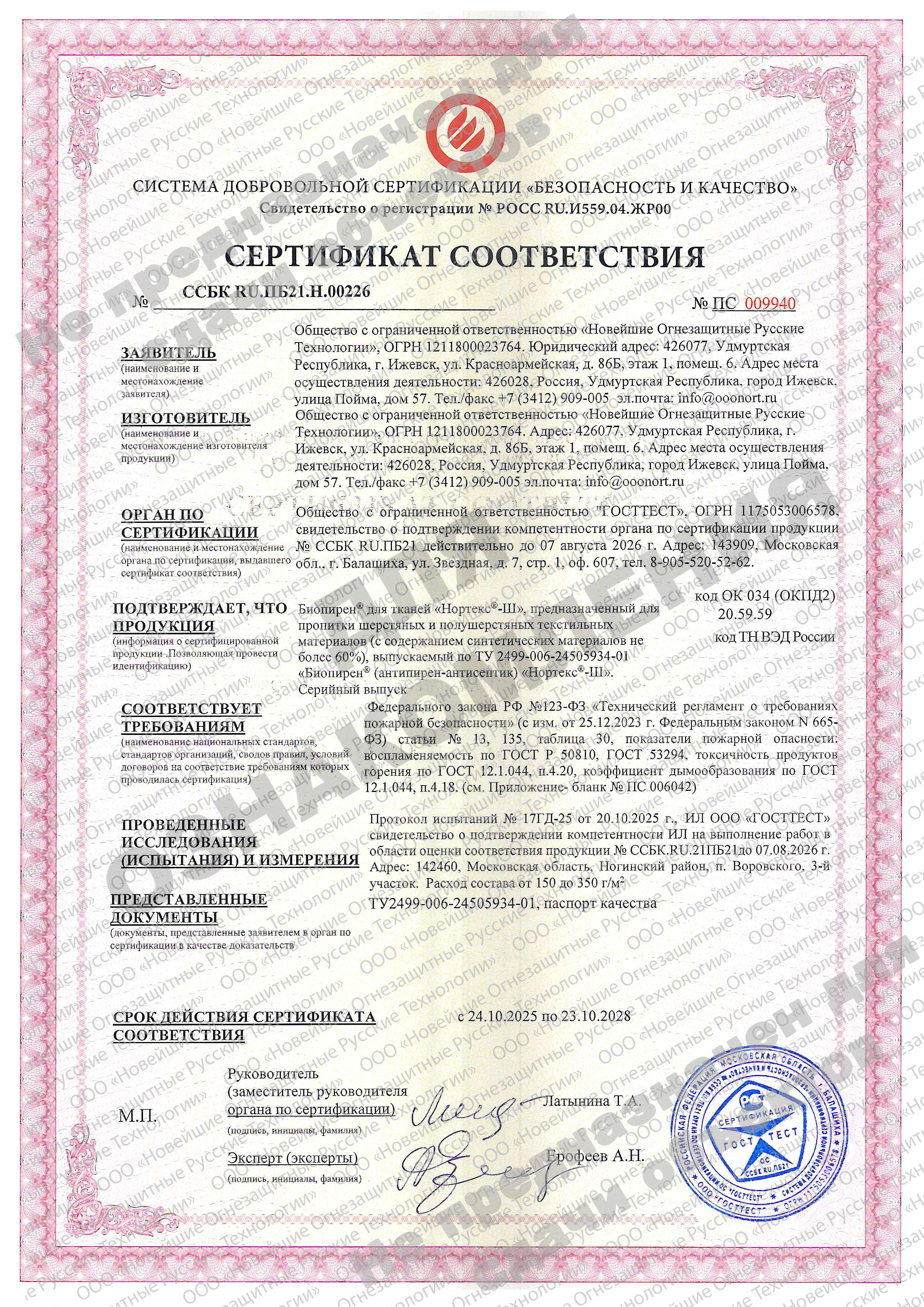 Где купить Биопирен® «Нортекс®-Ш» – огнебиозащитный состав для шерстяных тканей
