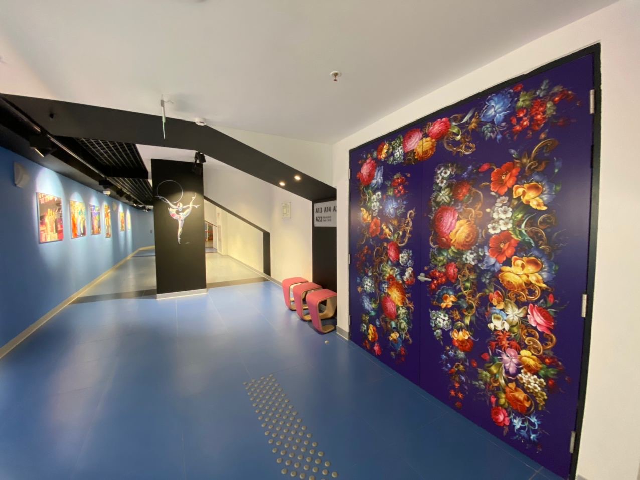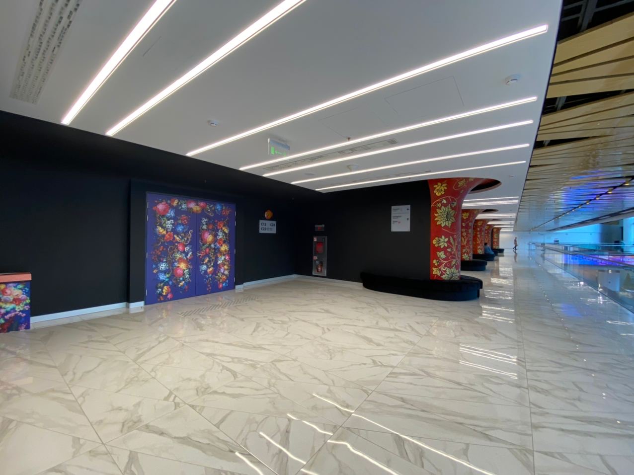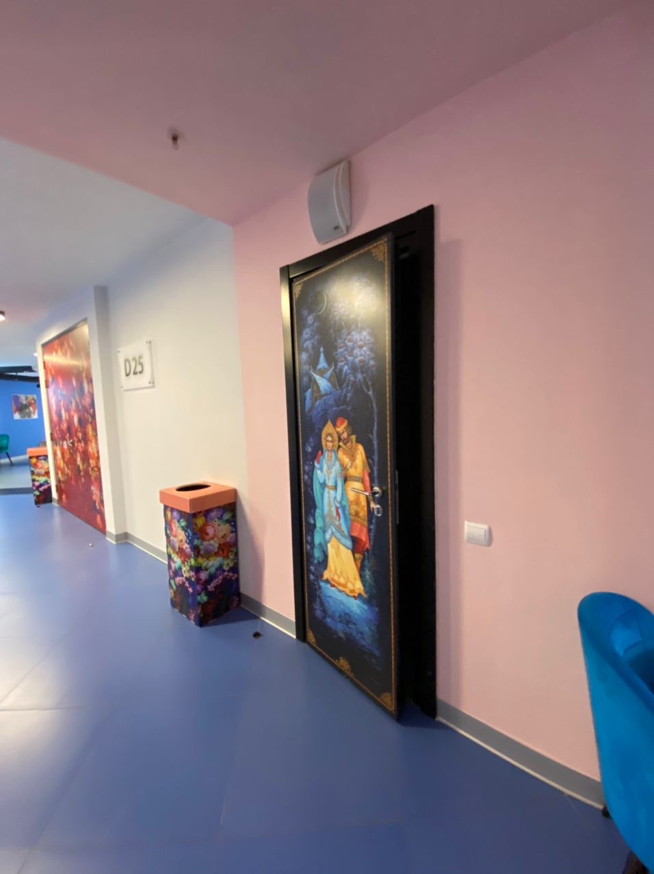 Дворец пропитан русской культурой. На входе – мозаика и колонны под хохлому. В оформлении только яркие, насыщенные цвета.